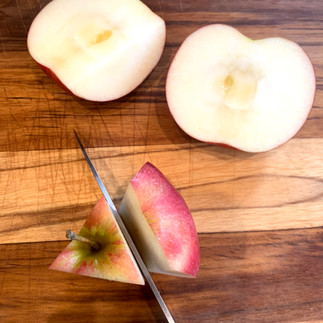 While your pie curst cooks cut your apples: Using the photos below as a guide, cut the apples into 3 sections, leaving behind the core. Then, using a sharp knife or a mandolin, cut the apples into roughly 1/16-1/32 of an inch slices (I've only ever used a knife). Put apples into a medium bowl and mix apple slices with 1/4 cup powdered sugar. Set aside. Your apples are going to melt that powdered sugar and start to soften just a tiny bit. This means that it will be easier to shap your apples as you get to the center of your tart! You're welcome :)